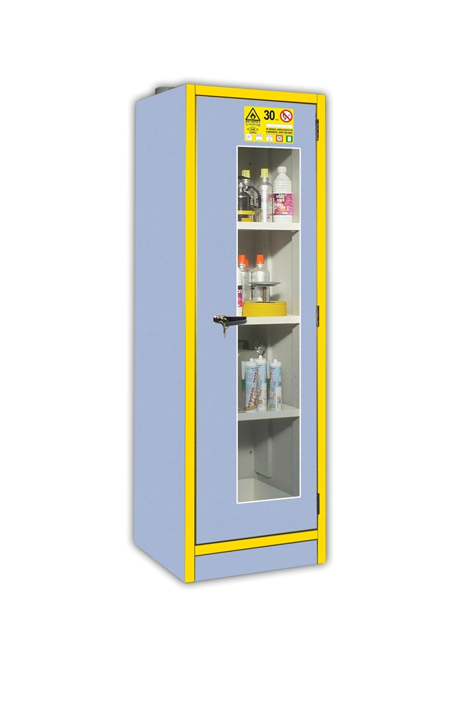 Armoire de sécurité pour produits inflammables, portes vitrées. Conforme à la norme EN 14470-1 et FM 6050, résistance au feu 30 min, 1 porte, 605 x 550 x H1980 mm.