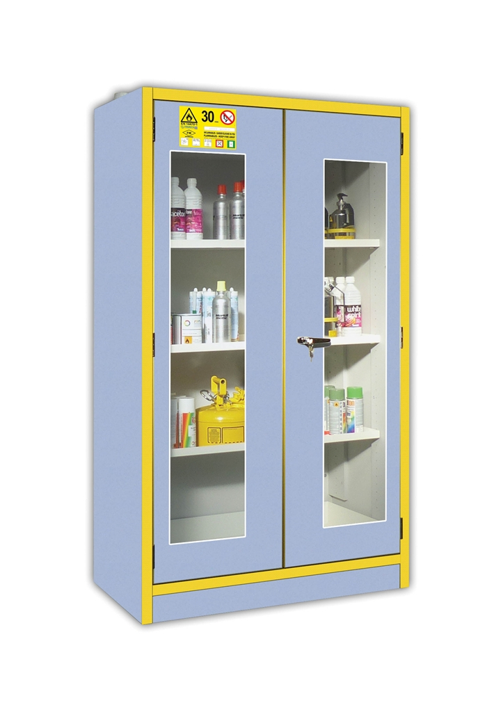 Armoire de sécurité pour produits inflammables, portes vitrées. Conforme à la norme EN 14470-1 et FM 6050, résistance au feu 30 min, 2 porte, 1115 x 550 x H1980 mm.