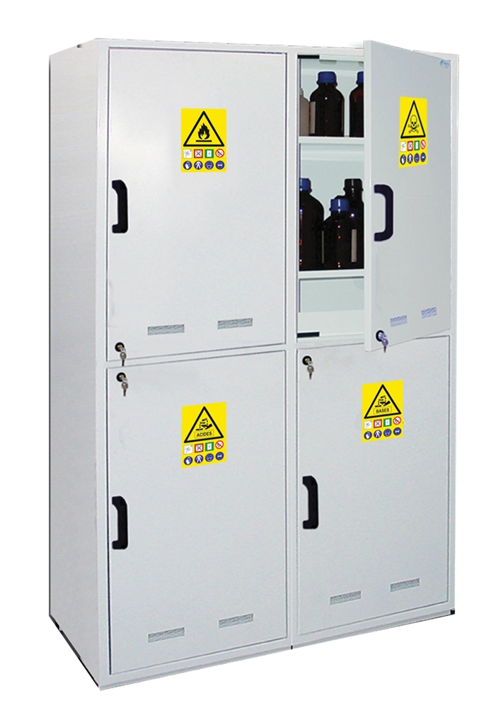 Armoire de sécurité pour produits dangereux avec 4 compartiments. Acier simple paroi, 4 portes, 1100 x 545 x H1825 mm.