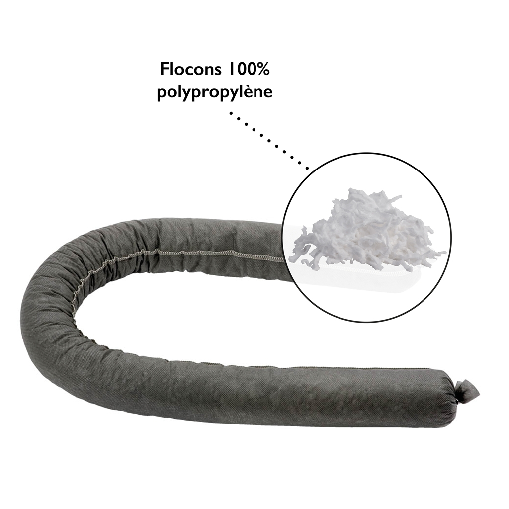Boudin absorbant tous liquides, flocons de polypropylène, 7,5 cm x 3 m, couleur gris.