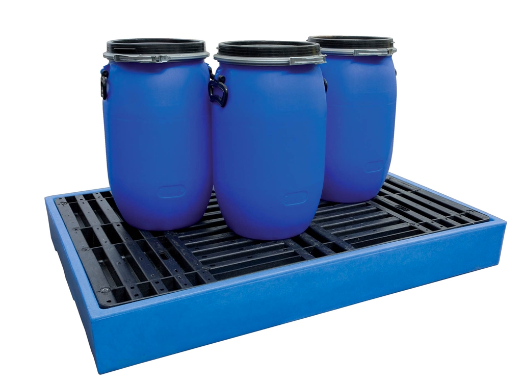 Plateforme de rétention en polyéthylène pur pour le stockage de fûts ou bidons. Caillebotis en polyéthylène amovible.