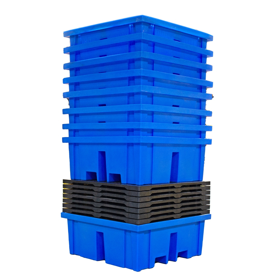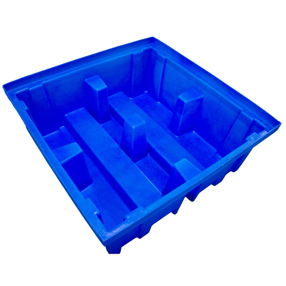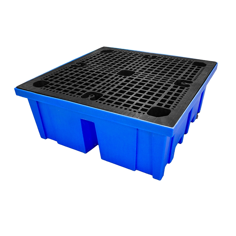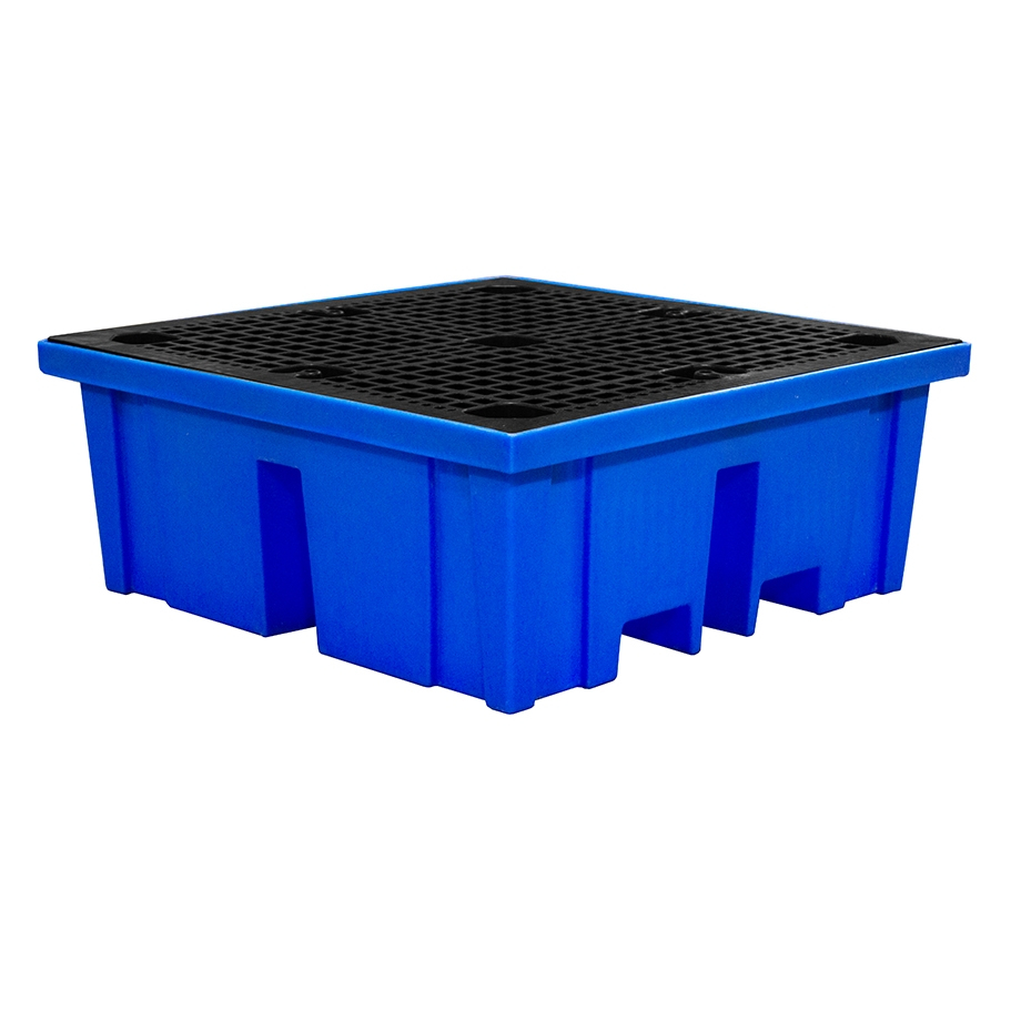 Bac de rétention en polyéthylène pur pour le stockage de quatre fûts debout de 200/220 litres avec caillebotis en polyéthylène amovible.