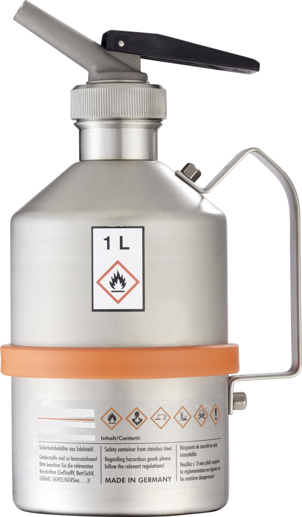 Récipient de sécurité, bidon pour stockage et distribution de produits inflammables et chimiques, inox, 130 x 295 mm.