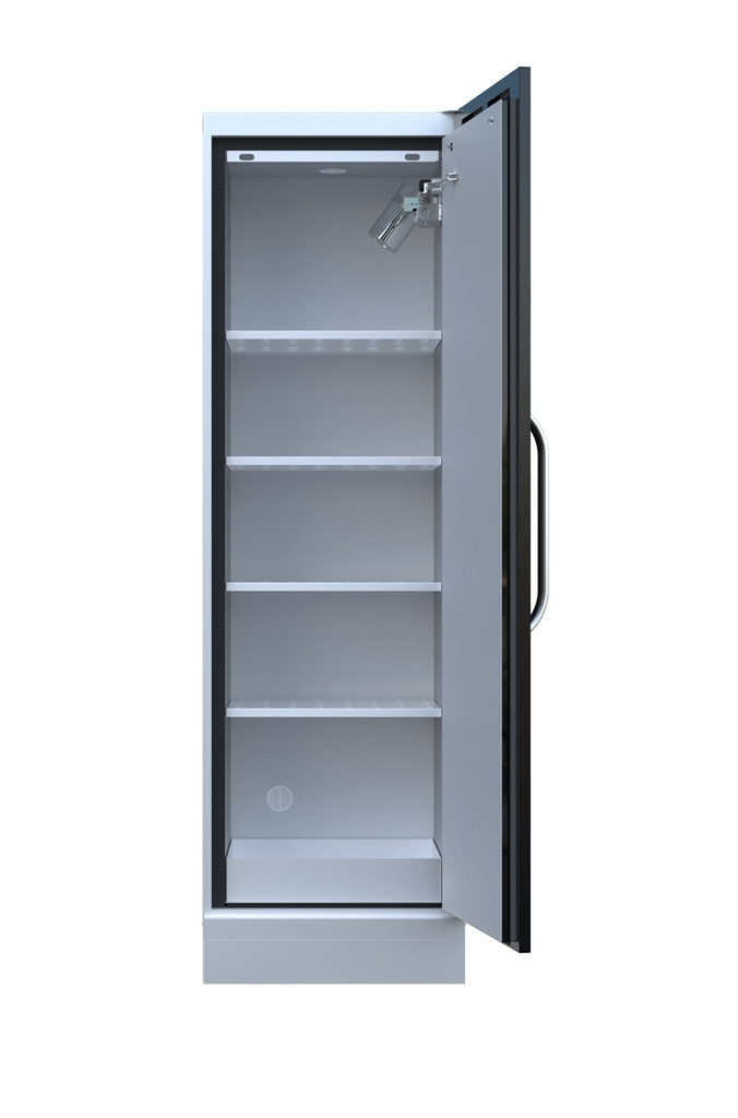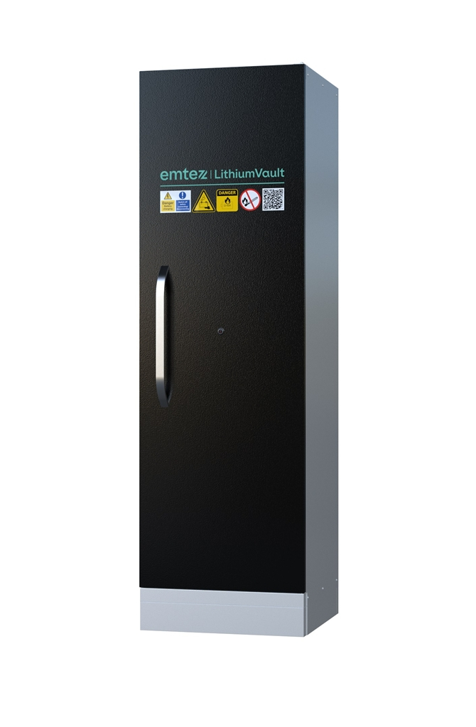 Armoire LithiumVault 1 porte avec extincteur FirePro pour l'extinction automatique de feu de batteries lithium-ion.