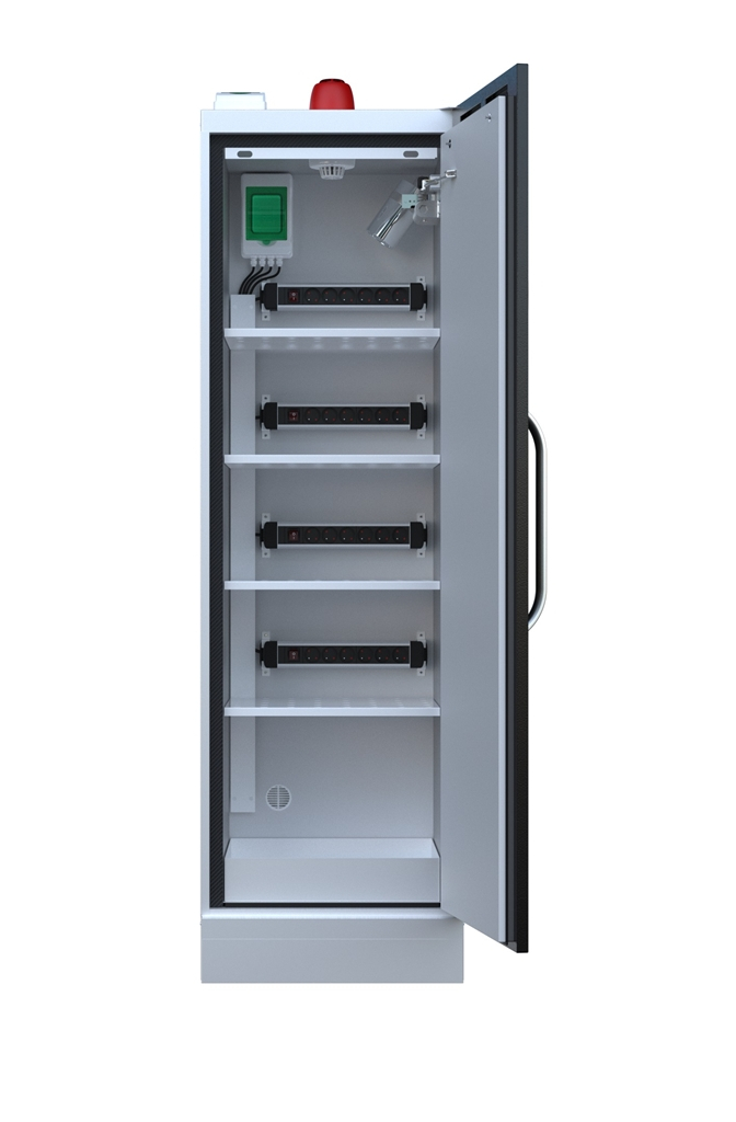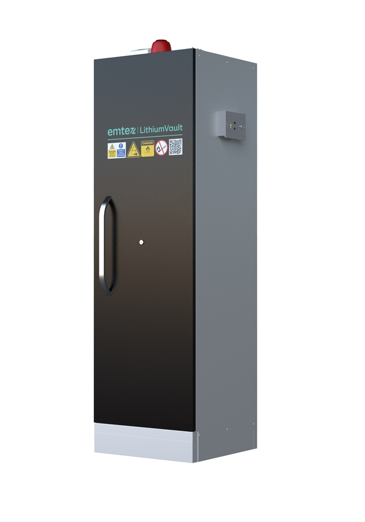 Armoire LithiumVault 1 porte pour le stockage et le chargement des batteries lithium-ion (32A) équipée d'un extincteur FirePro, d'une centrale incendie et de racks de prises électriques.