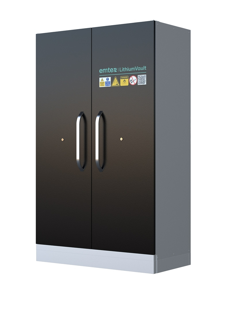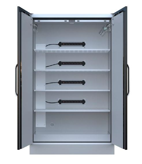 Armoire LithiumVault 2 portes avec extincteur FIREPRO, centrale incendie et racks de prises électriques. Armoire de sécurité conçue pour le stockage et le chargement des batteries lithium-ion. Dimensions extérieures (L x P x H) : 1200 x 600 x 2050 mm Dimensions intérieures (L x P x H) : 1095 x 446 x 1540 mm