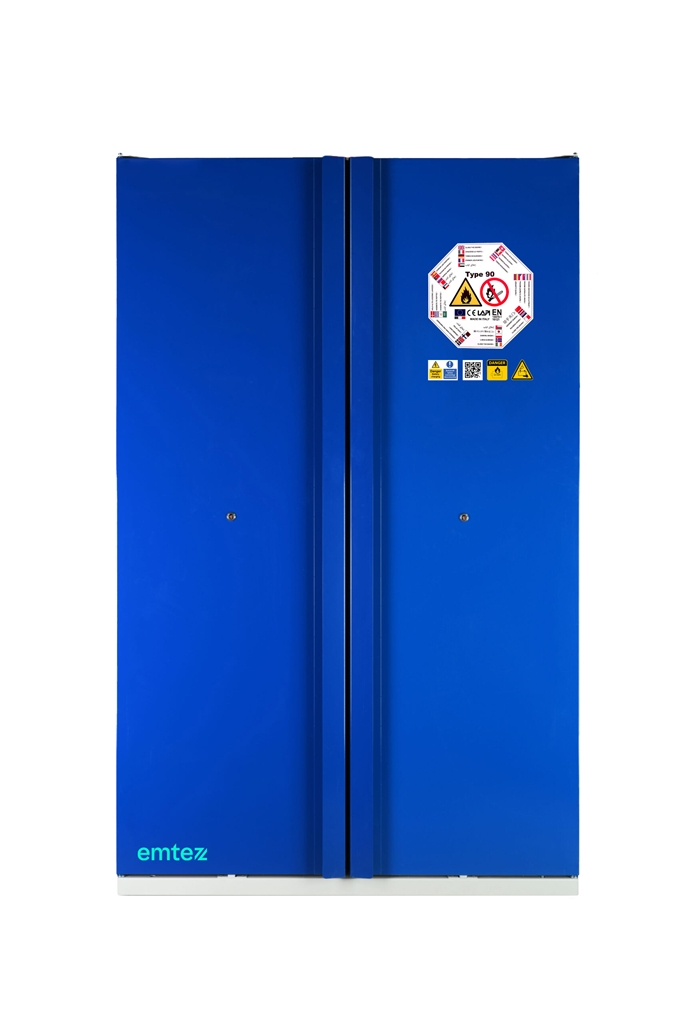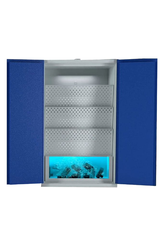 Armoire LithiumVault 2 portes avec extincteur FIREPRO, centrale incendie et racks de prises électriques. Armoire de sécurité conçue pour le stockage et le chargement des batteries lithium-ion. Dimensions extérieures (L x P x H) : 1200 x 600 x 2050 mm Dimensions intérieures (L x P x H) : 1095 x 446 x 1540 mm