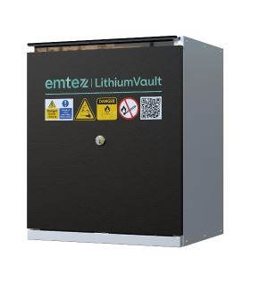 Armoire LithiumVault 2 portes avec extincteur FIREPRO et racks de prises électriques