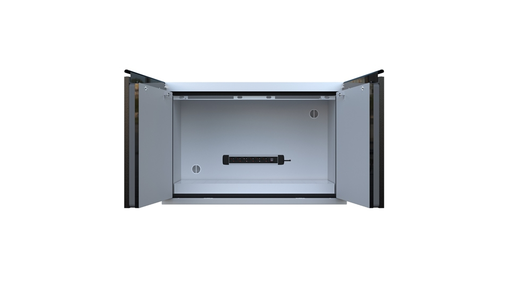 Armoire basse LithiumVault 2 portes avec rack de prises électriques conçue pour le stockage et le chargement de batteries lithium-ion.