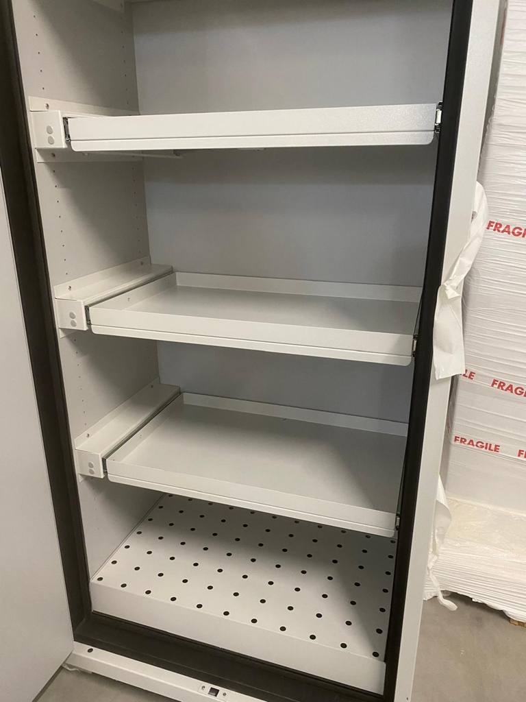 Armoire LithiumVault 2 portes avec extincteur FIREPRO, centrale incendie et racks de prises électriques. Armoire de sécurité conçue pour le stockage et le chargement des batteries lithium-ion. Dimensions extérieures (L x P x H) : 1200 x 600 x 2050 mm Dimensions intérieures (L x P x H) : 1095 x 446 x 1540 mm