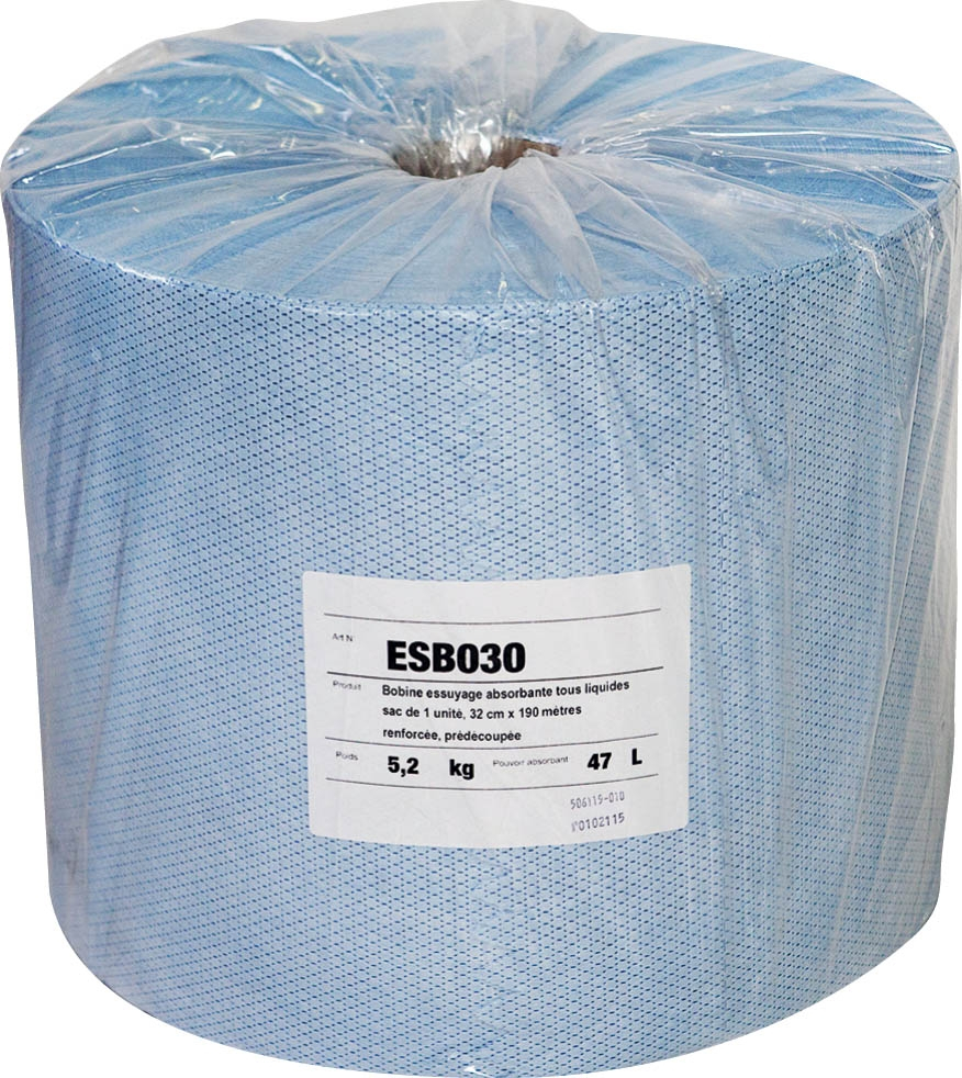 Essuyage industriel anti-peluche, bobine, pur fibre de polypropylène, 85 gr/m2, couleur bleu, 0,32 x 190 m. Sac de 1 bobine.