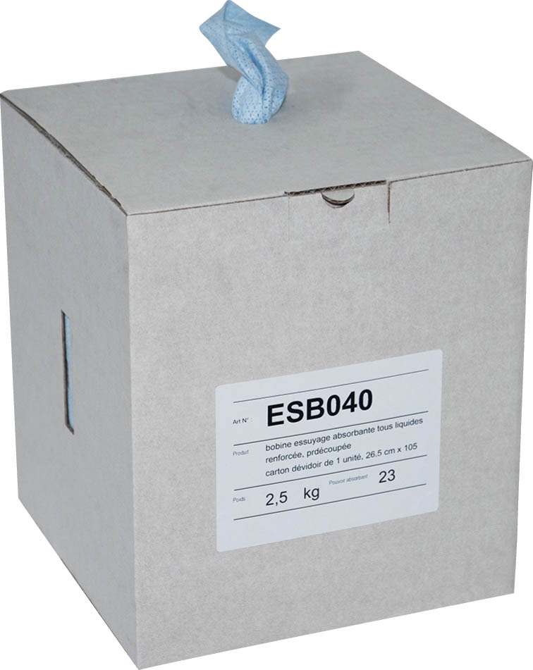 Essuyage industriel anti-peluche, bobine, pur fibre de polypropylène, 85 gr/m2, couleur bleu, 0,26 x 105 m. Carton dévidoir de 1 bobine.