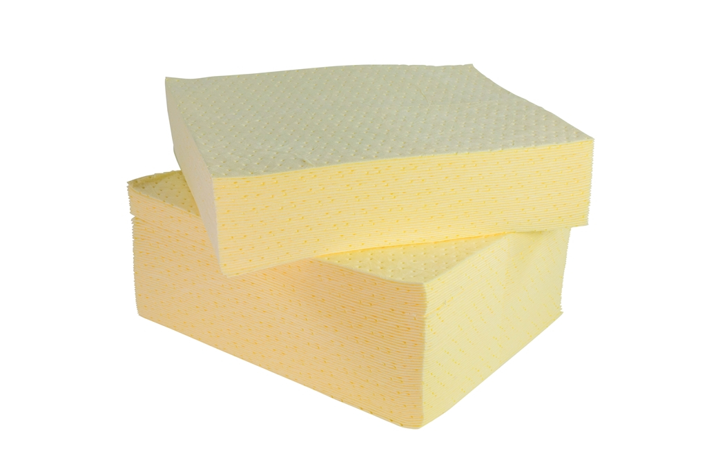 Feuille absorbante produits chimiques et tous liquides, pur fibre de polypropylène, simple épaisseur, 40 x 50 cm, couleur jaune.