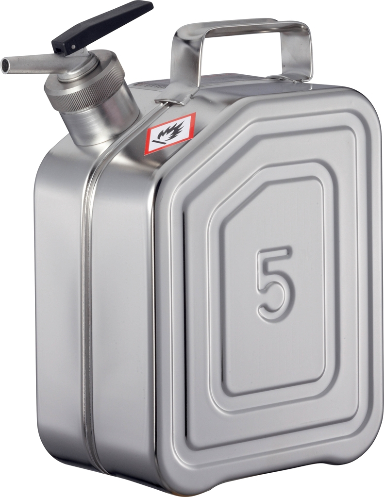 Récipient de sécurité, jerrican pour stockage et distribution de produits inflammables et chimiques, inox, 370 x 130 x H280 mm.