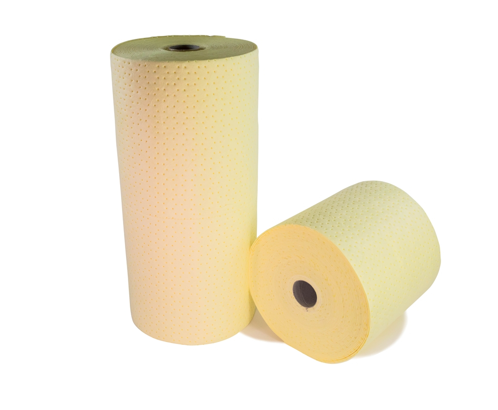 Rouleau absorbant produits chimiques et tous liquides avec voile de renfort recto-verso, pur fibre de polypropylène, double épaisseur, 40 m x 40 cm, couleur jaune.