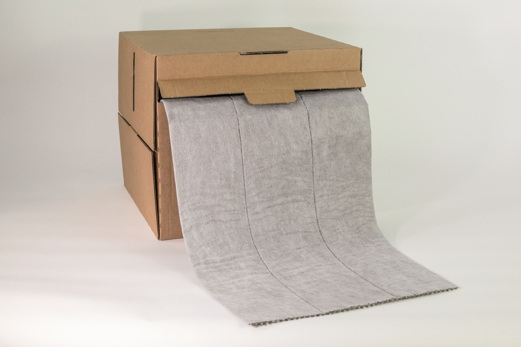 Rouleau absorbant tous liquides avec prédécoupe multiple et voile de renfort recto-verso, pur fibre de polypropylène, double épaisseur, 40 cm x 25 m, couleur gris.
