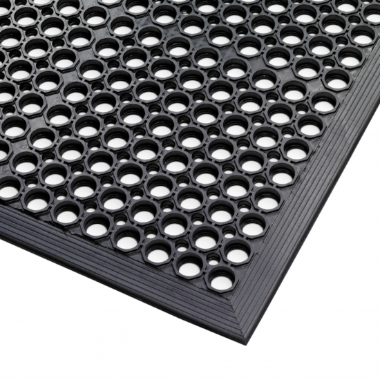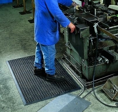 Tapis ergonomique perforé et antidérapant, utilisable dans des milieux secs et humides.