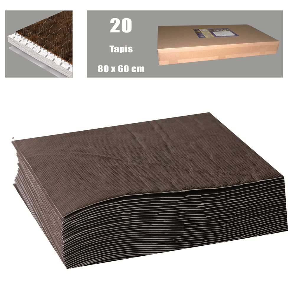 Tapis absorbant hydrocarbures avec voile extra renforcé et revers étanche, pur fibre de polypropylène, triple épaisseur, couleur marron et blanc.