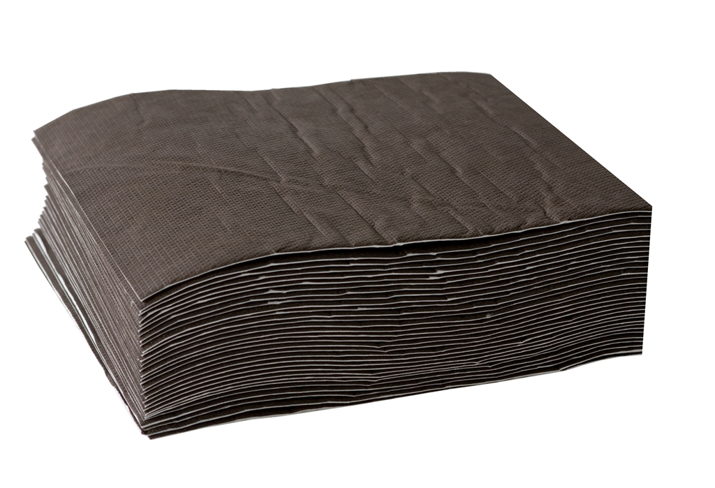 Tapis absorbant hydrocarbures avec voile extra renforcé et revers étanche, pur fibre de polypropylène, triple épaisseur, couleur marron et blanc.